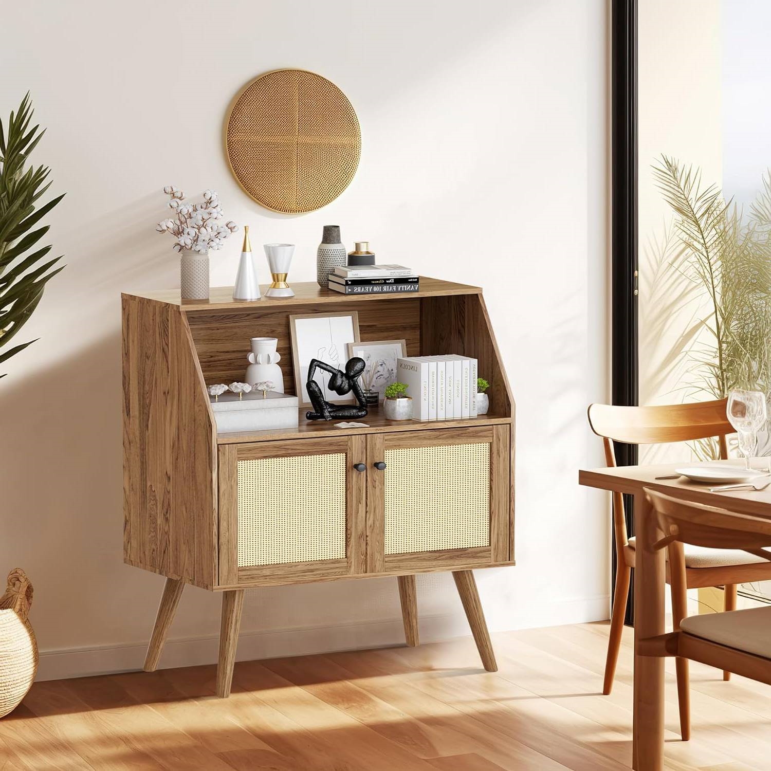 The Mid-Century Modern Buffet Cabinet Sideboard Table in Walnut Wood Finish is made of natural rattan, high-quality MDF board and superior iron, which has good load-bearing and stability. The issue of service life is no longer something you need to worry about. The perfect boho decor, If you put it in the dining room, living room, bedroom, hallway or bathroom,will bring a warm, natural feeling. Each package contains detailed installation instructions, and this Sideboard Buffet Cabinet consists of only a few parts, you can get a perfect Cabinet in no more than 25 minutes.