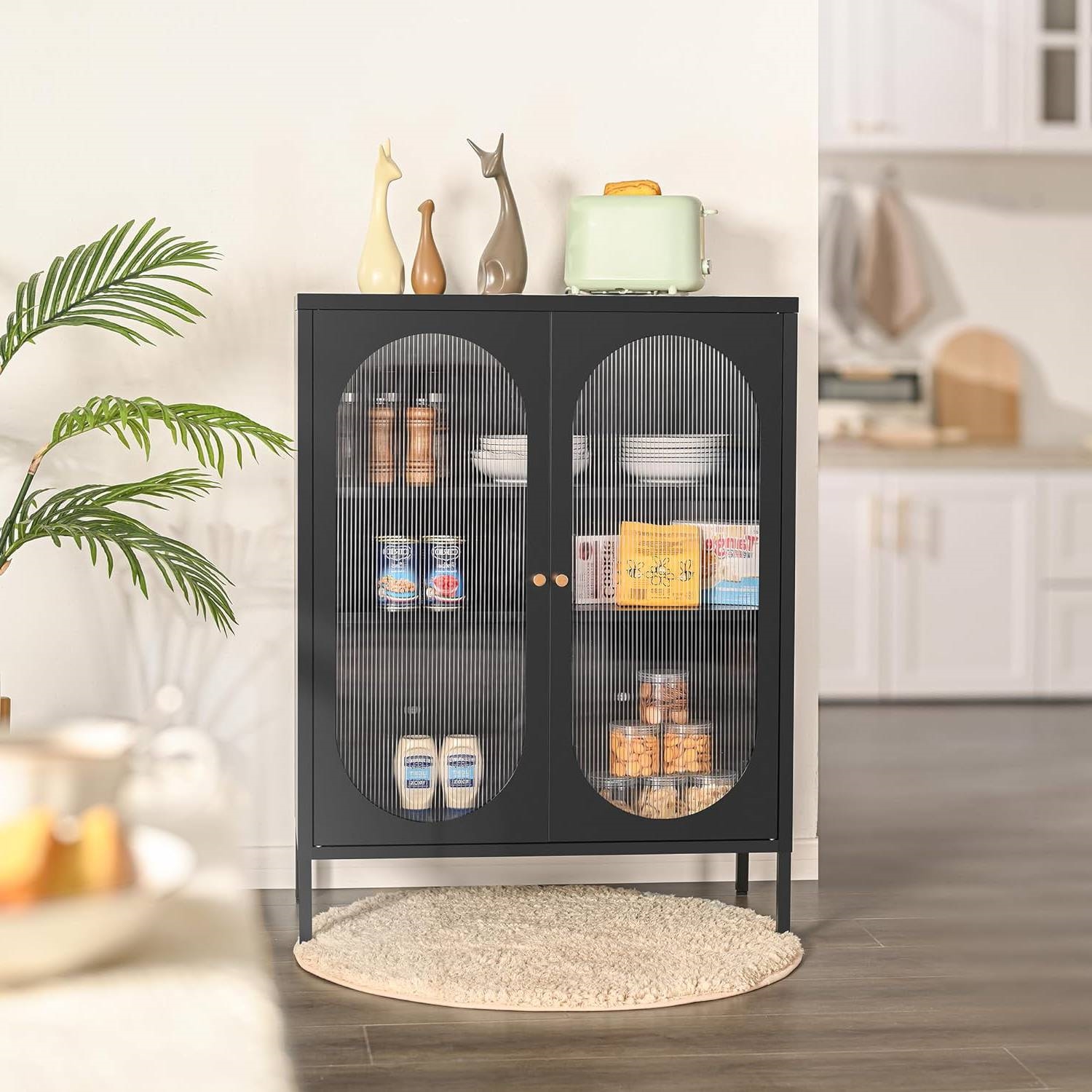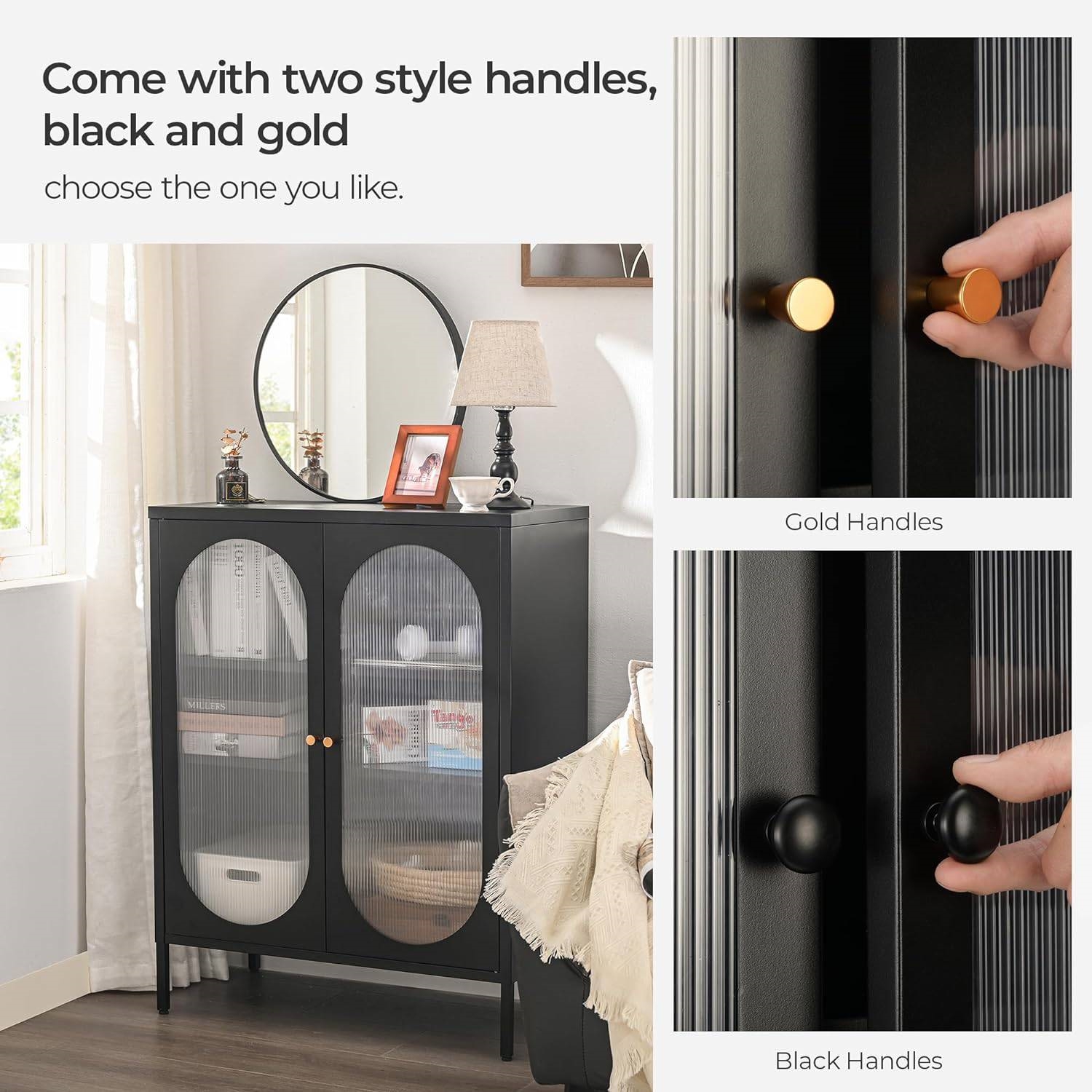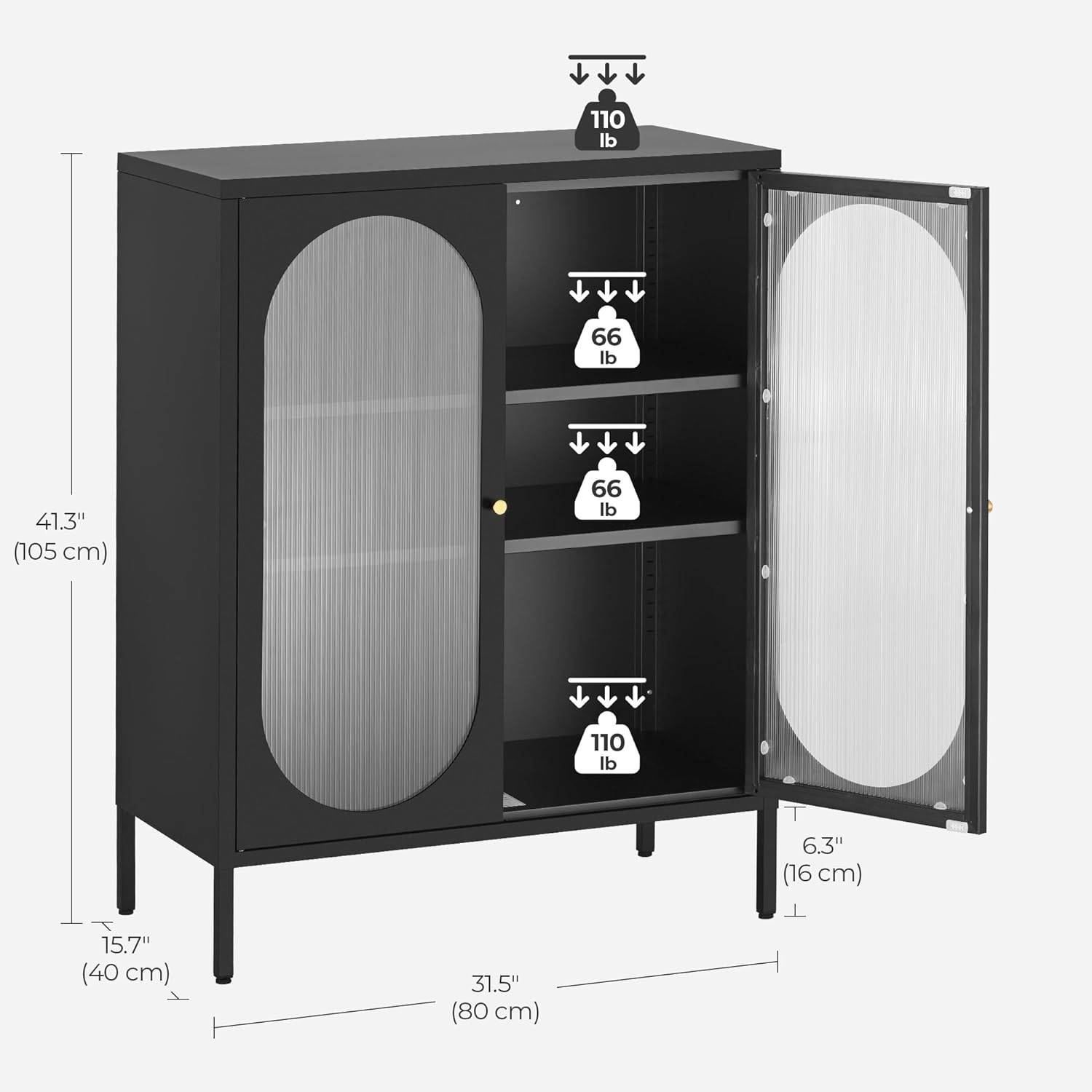 The 2-Door Buffet Sideboard Accent Table Liquor Cabinet in Black Wood Finish made of durable and long-lasting steel provides sturdy support for your items and offers a load capacity of 33 lb per shelf. The inner shelf is adjustable in height to fit items of different sizes. The sideboard cabinet with a spacious tabletop provides a place for your cutlery, wine bottles, toys and more, which fit all different storage needs. Our storage cabinet is designed with elegant doors with hazy PC board doors, which offer the functionality of masking sundries and increase interior hazy beauty. This cabinet will perfectly blend into any room decor: livingroom, dining room, kitchen, bar, salon, etc. The cupboard with magnetic locks and rubber buffers for closing quietly and tightly. And the matte, powder coatings make cleaning a much easier process. The sideboard cabinet provides handles in black and gold, you can choose your favorite combination. Easy-to-understand illustrated instructions, complete with installation tools and numbered parts make it easy to assemble this cabinet.