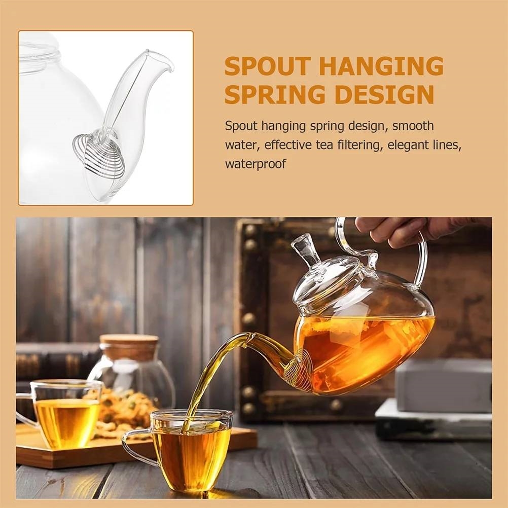 This 13.5oz/400 ml Glass Teapot with Removeable Metal Spout Hanging Spring, made of durable and premium glass material, so it can serve you for many years, will not easily deform and break. High-class material has its durability and practicality, good for heat resistant. It is perfect for making tea, flower tea and other hot drinks.