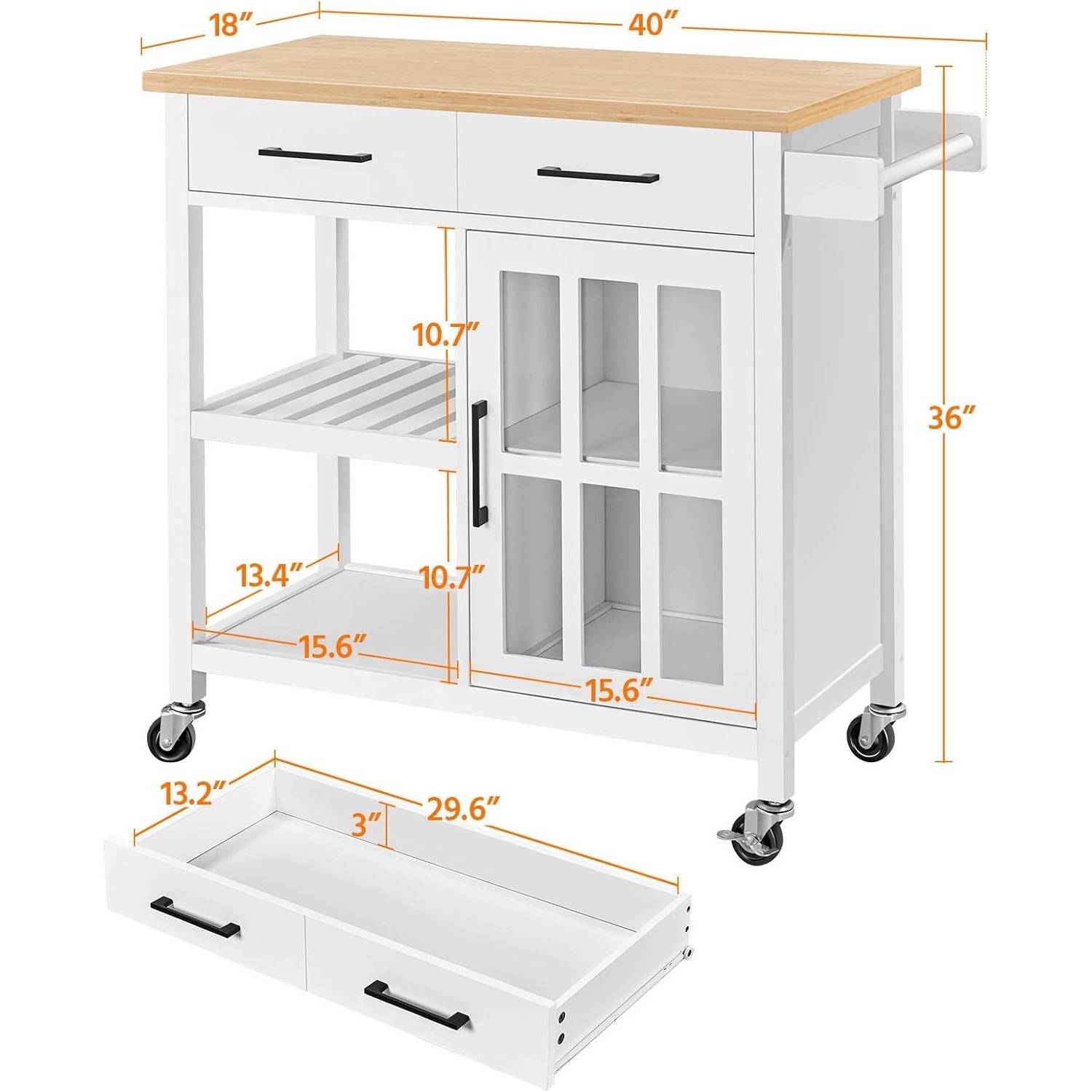 This White Kitchen Island Cart with Wood Top Storage Cabinet and Locking Casters is founded atop 4 caster wheels that provide must-have maneuverability. With a four-wheel base, it can go anywhere you need it and the 2 locking casters can keep it in place if needed. Measuring 91.5cm/36” long 45.5cm/18” wide, the bamboo countertop gives you extra elbow room as you prep, serve, and stow. And its varnished surface is easy to clean with a damp cloth. The transparent tempered glass door makes sure you can spot things you want inside the cabinet quickly. The interior shelf can be adjusted to three different heights to accommodate your storage needs. This kitchen island cart sports a classic finish for a neutral and elegant look and works well in both classic and contemporary kitchens. It also serves perfectly as a coffee bar or a place for cocktails when paired with counter-height stools. This kitchen island cart comes with step-by-step assembly instruction and numbered parts and hardware to make sure you can set it without difficulties. An Allen Key is also included for your convenience.