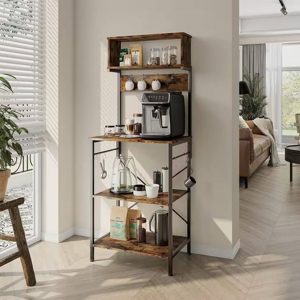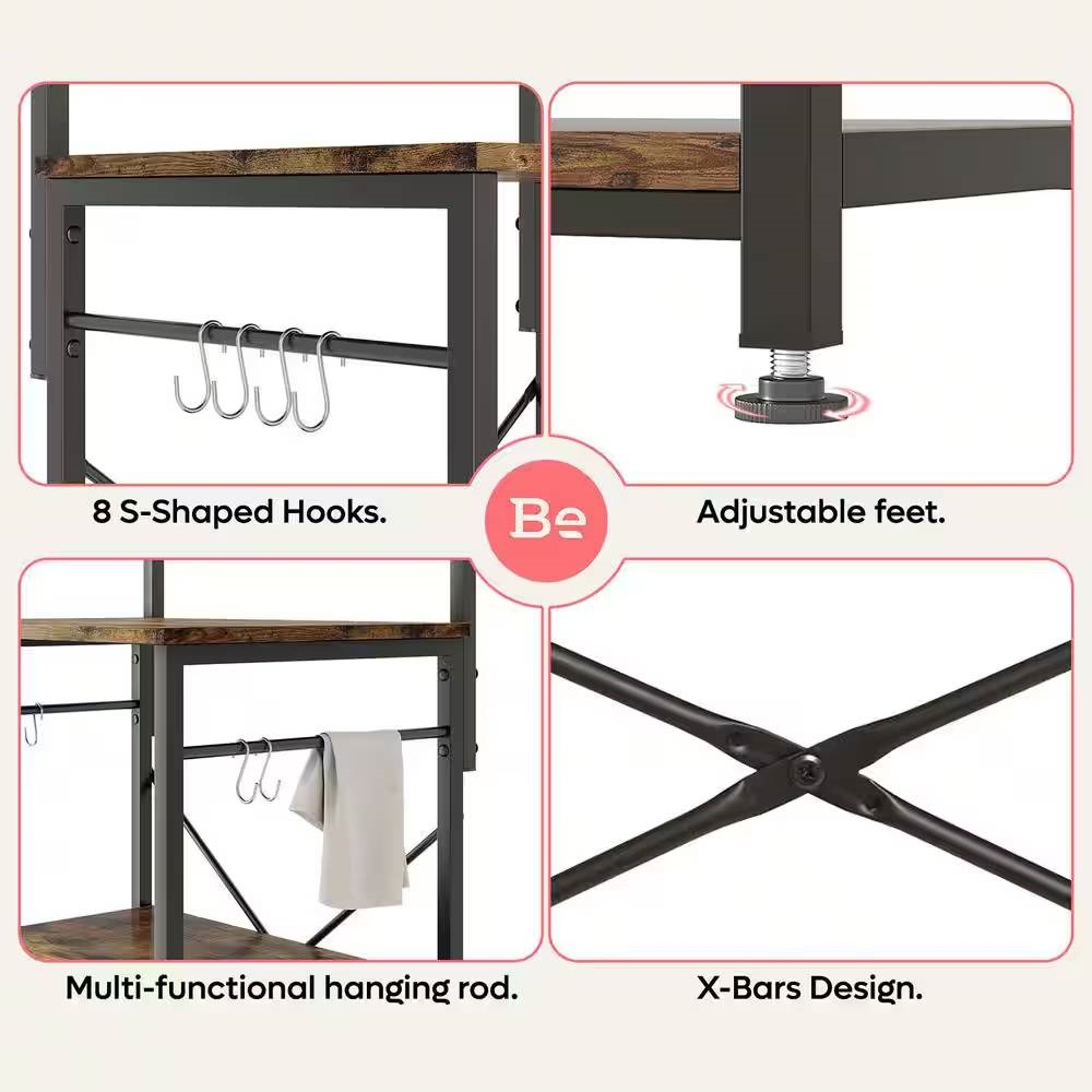 This Industrial Modern Kitchen Metal Wood Shelf Bakers Rack Microwave Stand with 3 power outlets, 1 air switch button and 6.5ft cable has UL certification. Safe for your coffee makers, toaster or bread maker. The kitchen baker's rack can be as a coffee bar, microwave oven stand, bakers racks, plant stand, printer stand, bookshelf, storage console shelf,etc. Made of CARB certified P2 particle board, Bestier wood bakers racks for kitchens with X-bars design has great stability and durability. 23.62" W x 60.16" H x 16.54"D. The microwave rack has 5 shelves to keep your vegetables, cooking and eating utensils, plates in plain sight and easy to use. With a user-friendly manual and tabbed part, the standing kitchen shelf can be easy to install.