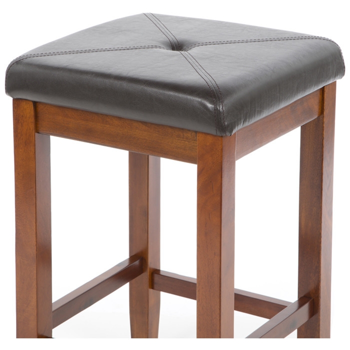 Comfort and style combined. The Set of 2 - 24-inch High Cherry Bar Stools w/ Cushion Faux Leather Seat features solid hardwood construction. The cushioned seat is upholstered in simulated leather, that is stain and spill resistant.