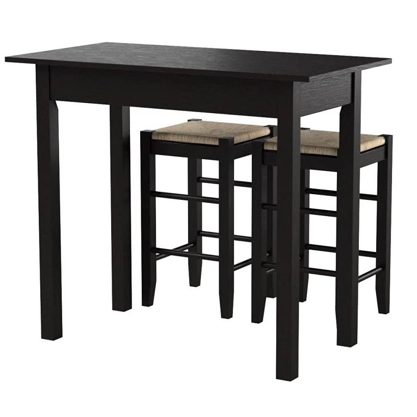 This 3 Piece Espresso Dining Set with Table and 2 Backless Stools has space saving convenience. This set features a simple rectangular table on long sturdy legs with two backless counter height stools with rush seats. Made from solid woods and MDF, and topped off with a rich Espresso finish. Stools tuck neatly under the table when not in use.