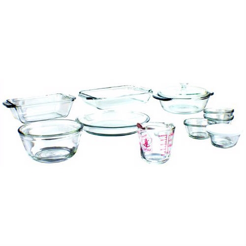 • Set includes: (1) 2-quart bake, (1) 1 1/2-quart casserole with glass cover, (1) 1 1/2-quart loaf, (1) 1-quart mixing bowl, (1) 9-inch pie, (1) 8-ounce measuring cup, (4) 6-ounce custard cups with plastic lids