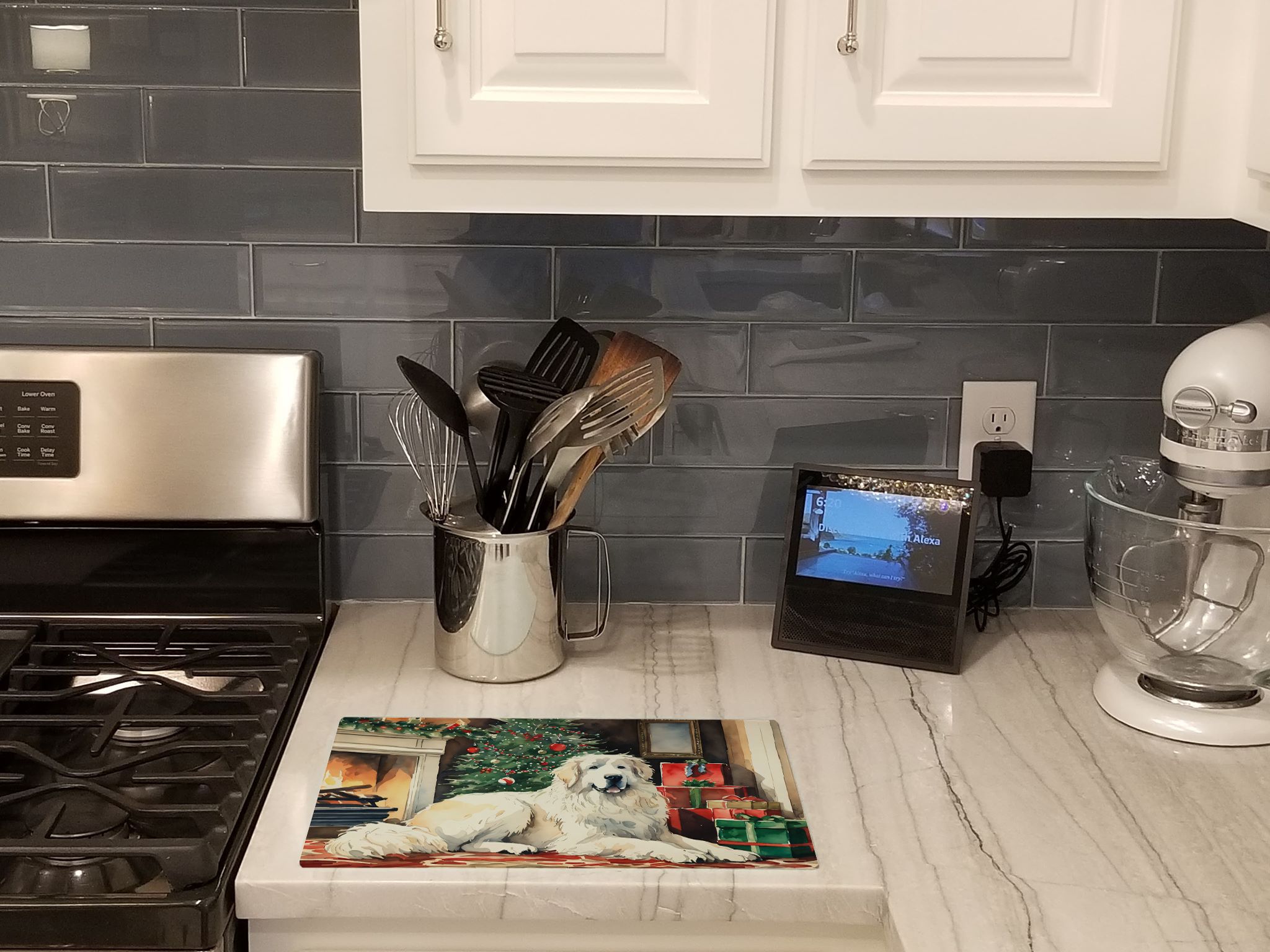 Glass Cutting Board featuring breed specific Great Pyrenees artwork. Celebrate Christmas with this Christmas Cutting Board. Introduce your kitchen to the vibrant, large Decorative Glass Cutting Board from Caroline's Treasures. Crafted from resilient tempered glass, this board is not only a utilitarian necessity but also a colorful art piece. With its generous dimensions of 15 inches in height and 12 inches in length, it offers ample space for all your cutting needs. Every piece showcases captivating artwork from distinguished artists, bringing an aesthetic edge to your kitchen. Beyond its attractive design, this cutting board ensures your countertop stays pristine and unscathed, owing to its heat-resistant properties. Engineered with user convenience in mind, it features non-skid feet for stability, and rounded corners for additional safety. Its robust construction renders it virtually unbreakable, guaranteeing longevity. The board comes with protective feet bumpers, maintaining its position during use. This product is recommended to be hand washed only. Proudly printed and assembled in the United States, this cutting board exemplifies superior craftsmanship. With Caroline's Treasures' Decorative Glass Cutting Board, you're investing in a blend of functionality and artistic flair.