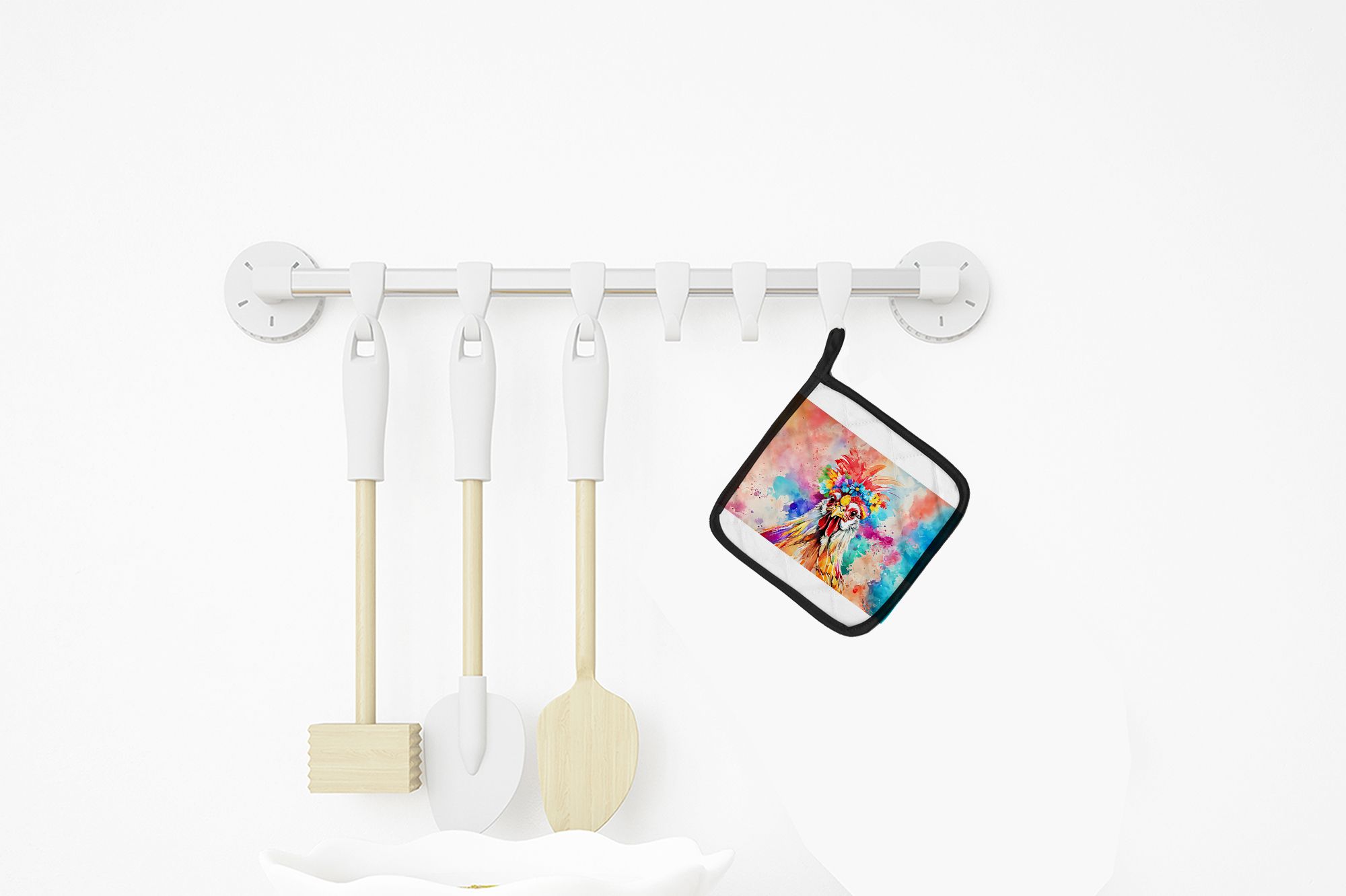 Pair of Pot Holders featuring breed specific Polish Poland Rooster artwork. A Pair of Pot Holders to match your kitchen decor. Made in the USA these are thick and functional. Full color artwork decorates the front polyester fabric of the hot pad and accented by a black trim. Use these at as a trivet for your Thanksgiving or Christmas tablescape. Filled with insulated fabric and quilted for durability. These colorful pot holders will make a great gift for your favorite home cook or executive chef. Each pot holder measures approximately 7 1/2 inches by 7 1/2 inches. A hanging tab is included.