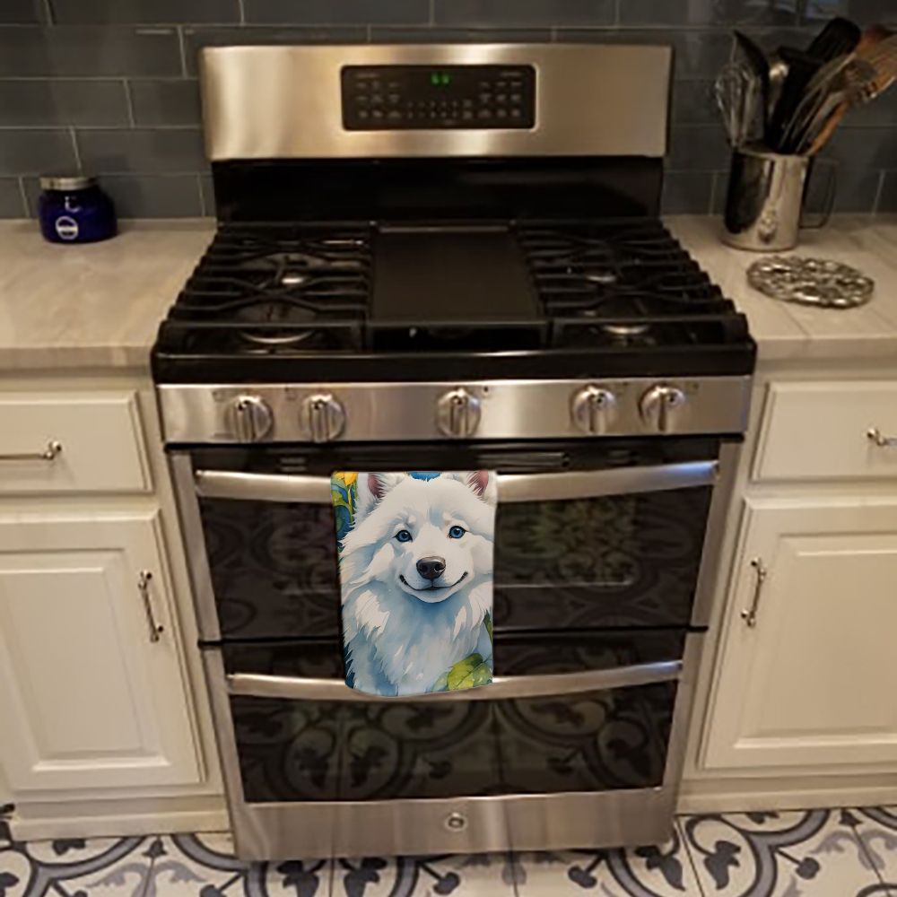 Kitchen Towel featuring breed specific American Eskimo artwork. Experience the perfect blend of aesthetic appeal and functional excellence with our Plush Velour Kitchen Towels. These are not your ordinary decorative kitchen towels that gather dust. Instead, they are designed to be as practical as they are stylish. The front layer of our towel is constructed from a minky plush polyester, known for its durability and color retention. Unlike conventional kitchen towels, the artwork on our towels is dyed directly into the fabric, ensuring vibrant colors that last. Polish your glassware to a brilliant sparkle using the plush front side of the towel. Flip to the back, crafted from 100% cotton terry loop, to exploit its exceptional absorbency for drying dishes or wiping down counters. Our kitchen towels redefine the concept of functional art, offering lasting quality that maintains the towel's shape over time. Measuring 15 inches by 25 inches and weighing 2.3 lbs per dozen, these towels deliver an overwhelming sensory experience with their soft, plush, and smooth texture. The edges are meticulously finished with binding, enhancing their durability and visual appeal. For your convenience, these towels are machine washable and can be dried on low heat. After the first wash, the top fabric becomes even softer and fluffier, eliminating the need for ironing. Treat your kitchen to the luxury and functionality it deserves with our plush velour kitchen towels.