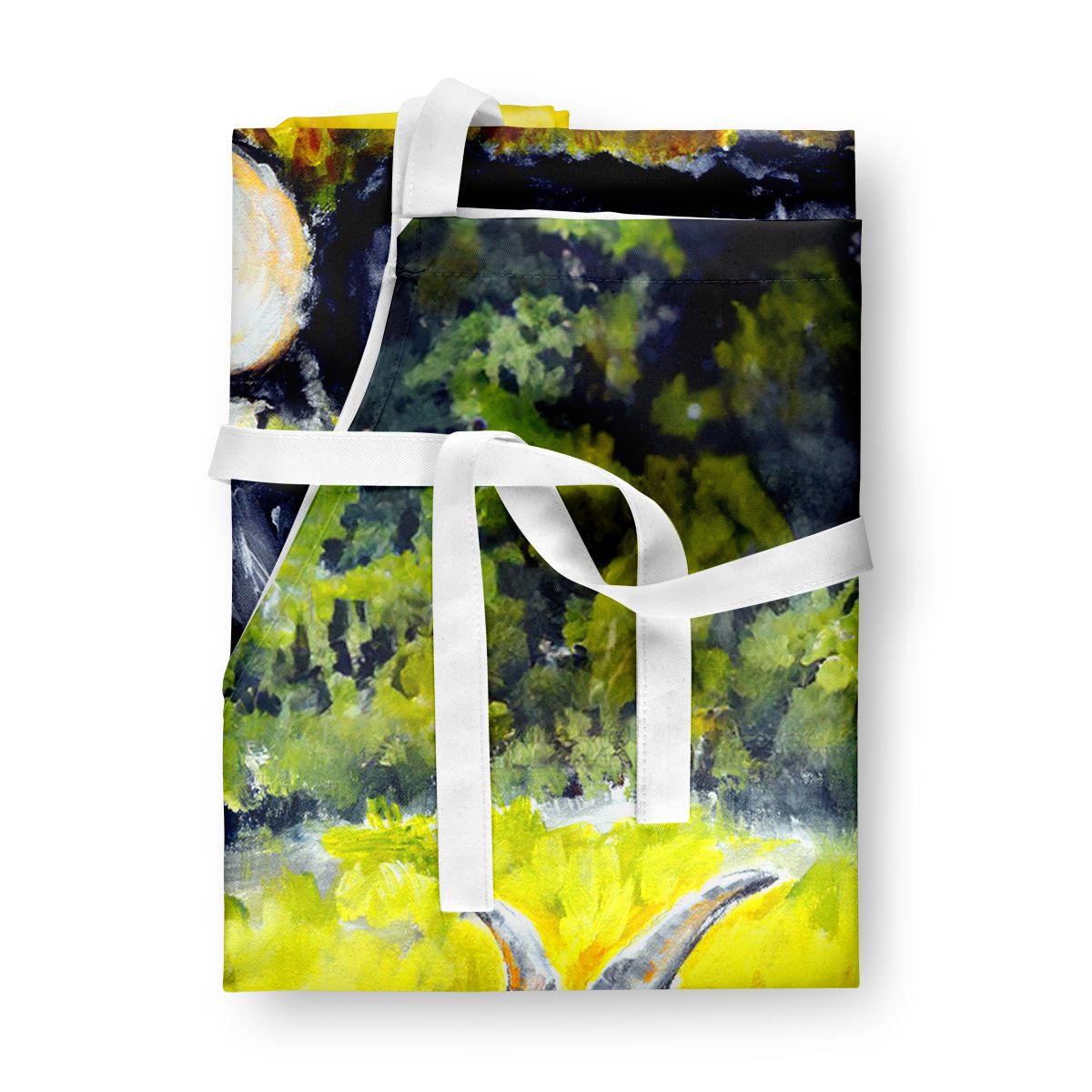 Elevate your cooking, baking, and grilling experiences with our versatile Kitchen or BBQ Apron. This Bib Style apron isn't just limited to culinary activities - it also serves as an excellent baking apron, artist apron, server apron, gardening apron, or even a dog grooming apron. The apron showcases vibrant full-color artwork contributed by one of our talented artists, bringing a dash of style to your daily tasks. With dimensions of approximately 27"W x 30"H, it provides ample coverage to protect your clothing from spills and splashes. Our apron is meticulously crafted from 100% Ultra Spun Polyester, known for its durability and lightweight nature. The apron comes with white tie straps, ensuring a comfortable and adjustable fit for all. It's a perfect choice for kitchen apron enthusiasts, whether you are a woman or a man. Designed for easy maintenance, this apron is fully machine washable. The quick-drying polyester material actively reduces staining, keeping your apron looking fresh and new for longer. Our beautifully designed apron isn't just a functional kitchen accessory - it's a fashion statement in the culinary world!