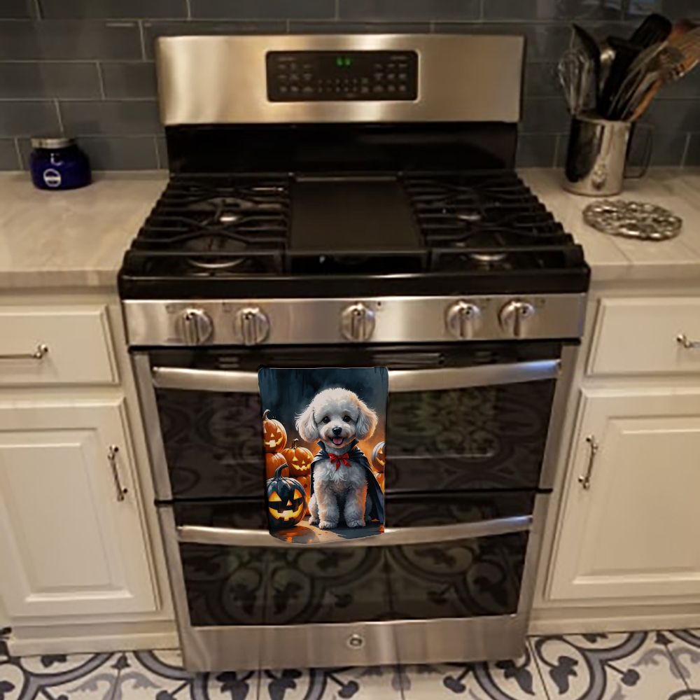 Kitchen Towel featuring breed specific Poodle artwork. Celebrate Halloween with this Halloween Kitchen Towel. Experience the perfect blend of aesthetic appeal and functional excellence with our Plush Velour Kitchen Towels. These are not your ordinary decorative kitchen towels that gather dust. Instead, they are designed to be as practical as they are stylish. The front layer of our towel is constructed from a minky plush polyester, known for its durability and color retention. Unlike conventional kitchen towels, the artwork on our towels is dyed directly into the fabric, ensuring vibrant colors that last. Polish your glassware to a brilliant sparkle using the plush front side of the towel. Flip to the back, crafted from 100% cotton terry loop, to exploit its exceptional absorbency for drying dishes or wiping down counters. Our kitchen towels redefine the concept of functional art, offering lasting quality that maintains the towel's shape over time. Measuring 15 inches by 25 inches and weighing 2.3 lbs per dozen, these towels deliver an overwhelming sensory experience with their soft, plush, and smooth texture. The edges are meticulously finished with binding, enhancing their durability and visual appeal. For your convenience, these towels are machine washable and can be dried on low heat. After the first wash, the top fabric becomes even softer and fluffier, eliminating the need for ironing. Treat your kitchen to the luxury and functionality it deserves with our plush velour kitchen towels.