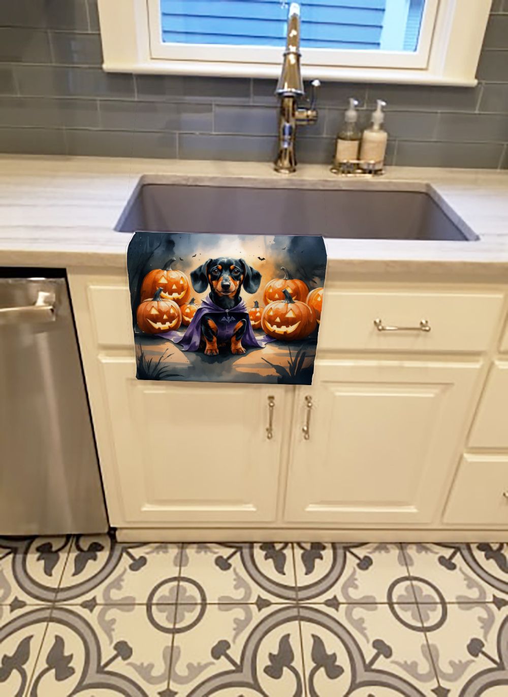 Kitchen Towel featuring breed specific Dachshund artwork. Celebrate Halloween with this Halloween Kitchen Towel. Experience the perfect blend of aesthetic appeal and functional excellence with our Plush Velour Kitchen Towels. These are not your ordinary decorative kitchen towels that gather dust. Instead, they are designed to be as practical as they are stylish. The front layer of our towel is constructed from a minky plush polyester, known for its durability and color retention. Unlike conventional kitchen towels, the artwork on our towels is dyed directly into the fabric, ensuring vibrant colors that last. Polish your glassware to a brilliant sparkle using the plush front side of the towel. Flip to the back, crafted from 100% cotton terry loop, to exploit its exceptional absorbency for drying dishes or wiping down counters. Our kitchen towels redefine the concept of functional art, offering lasting quality that maintains the towel's shape over time. Measuring 15 inches by 25 inches and weighing 2.3 lbs per dozen, these towels deliver an overwhelming sensory experience with their soft, plush, and smooth texture. The edges are meticulously finished with binding, enhancing their durability and visual appeal. For your convenience, these towels are machine washable and can be dried on low heat. After the first wash, the top fabric becomes even softer and fluffier, eliminating the need for ironing. Treat your kitchen to the luxury and functionality it deserves with our plush velour kitchen towels.