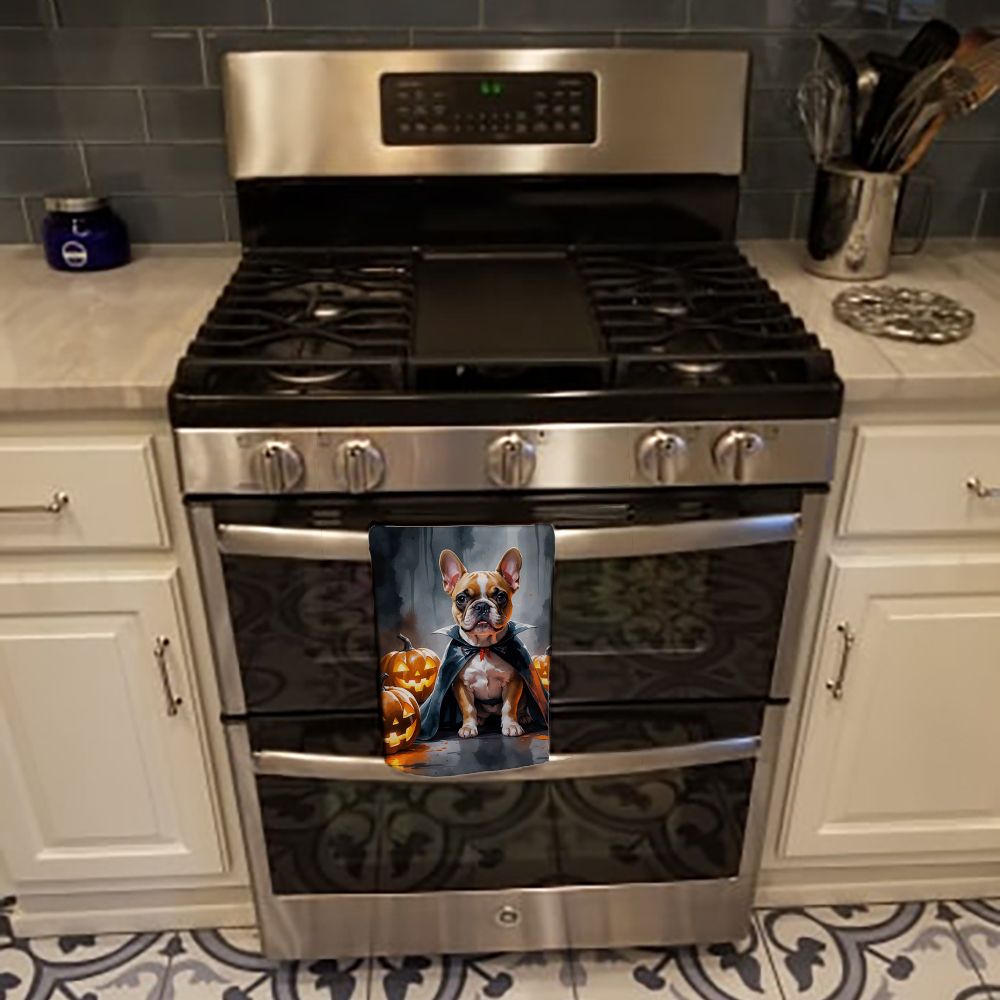 Kitchen Towel featuring breed specific French Bulldog artwork. Celebrate Halloween with this Halloween Kitchen Towel. Experience the perfect blend of aesthetic appeal and functional excellence with our Plush Velour Kitchen Towels. These are not your ordinary decorative kitchen towels that gather dust. Instead, they are designed to be as practical as they are stylish. The front layer of our towel is constructed from a minky plush polyester, known for its durability and color retention. Unlike conventional kitchen towels, the artwork on our towels is dyed directly into the fabric, ensuring vibrant colors that last. Polish your glassware to a brilliant sparkle using the plush front side of the towel. Flip to the back, crafted from 100% cotton terry loop, to exploit its exceptional absorbency for drying dishes or wiping down counters. Our kitchen towels redefine the concept of functional art, offering lasting quality that maintains the towel's shape over time. Measuring 15 inches by 25 inches and weighing 2.3 lbs per dozen, these towels deliver an overwhelming sensory experience with their soft, plush, and smooth texture. The edges are meticulously finished with binding, enhancing their durability and visual appeal. For your convenience, these towels are machine washable and can be dried on low heat. After the first wash, the top fabric becomes even softer and fluffier, eliminating the need for ironing. Treat your kitchen to the luxury and functionality it deserves with our plush velour kitchen towels.