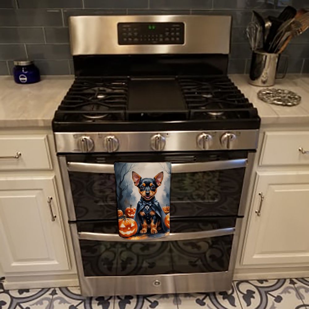 Kitchen Towel featuring breed specific Miniature Pinscher artwork. Celebrate Halloween with this Halloween Kitchen Towel. Experience the perfect blend of aesthetic appeal and functional excellence with our Plush Velour Kitchen Towels. These are not your ordinary decorative kitchen towels that gather dust. Instead, they are designed to be as practical as they are stylish. The front layer of our towel is constructed from a minky plush polyester, known for its durability and color retention. Unlike conventional kitchen towels, the artwork on our towels is dyed directly into the fabric, ensuring vibrant colors that last. Polish your glassware to a brilliant sparkle using the plush front side of the towel. Flip to the back, crafted from 100% cotton terry loop, to exploit its exceptional absorbency for drying dishes or wiping down counters. Our kitchen towels redefine the concept of functional art, offering lasting quality that maintains the towel's shape over time. Measuring 15 inches by 25 inches and weighing 2.3 lbs per dozen, these towels deliver an overwhelming sensory experience with their soft, plush, and smooth texture. The edges are meticulously finished with binding, enhancing their durability and visual appeal. For your convenience, these towels are machine washable and can be dried on low heat. After the first wash, the top fabric becomes even softer and fluffier, eliminating the need for ironing. Treat your kitchen to the luxury and functionality it deserves with our plush velour kitchen towels.