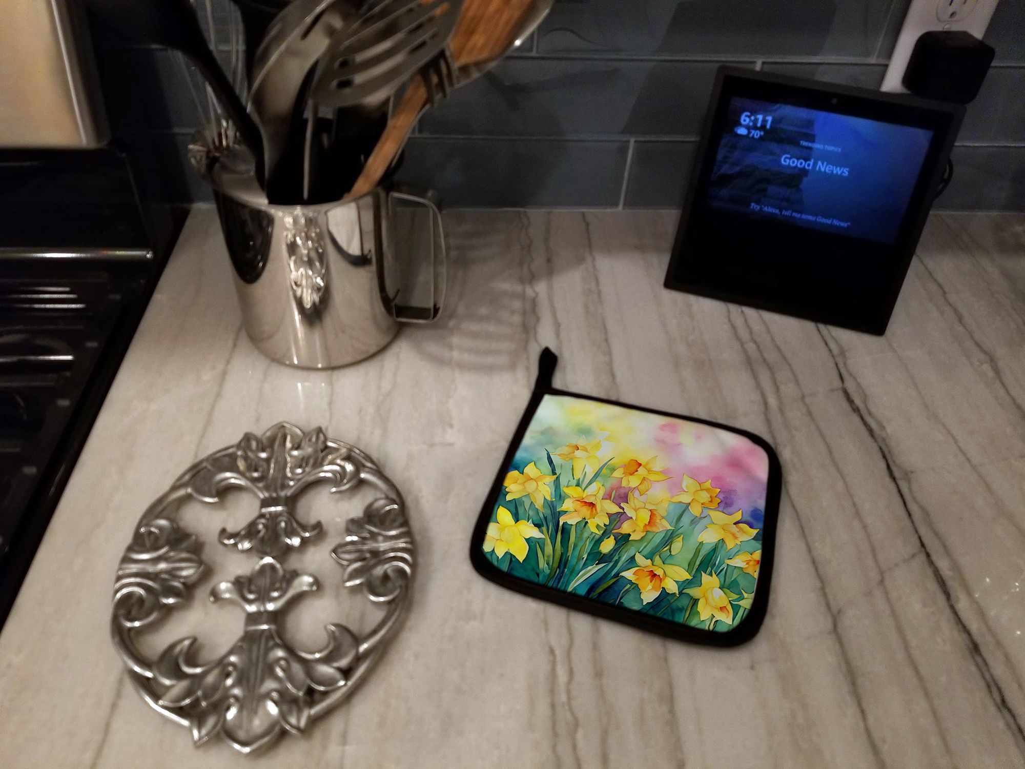 Pair of Pot Holders featuring breed specific Daffodils artwork. A Pair of Pot Holders to match your kitchen decor. Made in the USA these are thick and functional. Full color artwork decorates the front polyester fabric of the hot pad and accented by a black trim. Use these at as a trivet for your Thanksgiving or Christmas tablescape. Filled with insulated fabric and quilted for durability. These colorful pot holders will make a great gift for your favorite home cook or executive chef. Each pot holder measures approximately 7 1/2 inches by 7 1/2 inches. A hanging tab is included.