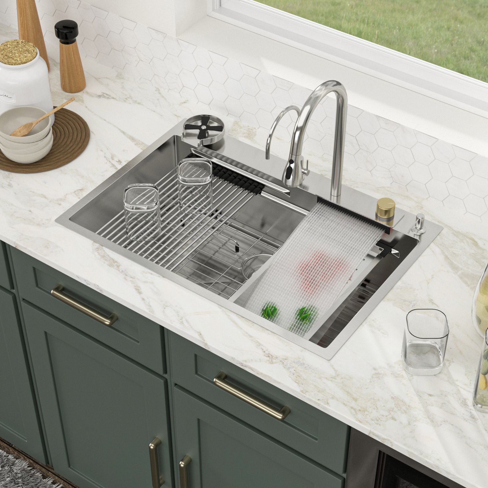 Product Name:33-inch Topmount Workstation Kitchen SInk Drop-in Two-Tiered Ledge Single Bowl Stainless Steel Kitchen Sink, Color in Brushed Nickel