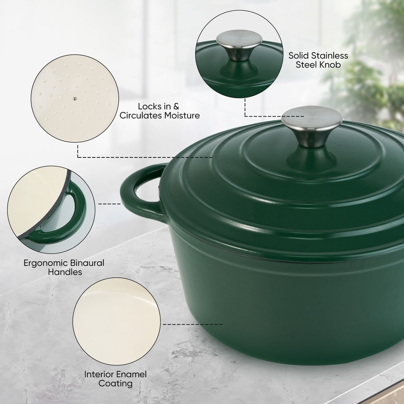 ��ENCLOSED THERMAL CIRCLE: This enameled dutch oven pot is design with circulating shower type lid, the raised design of the pot cover allows water vapor to circulate in the pot and locks the nutrition and moisture of the food, evenly fall on the food to maintain the original nutrition, possess pretty heat retention performance.